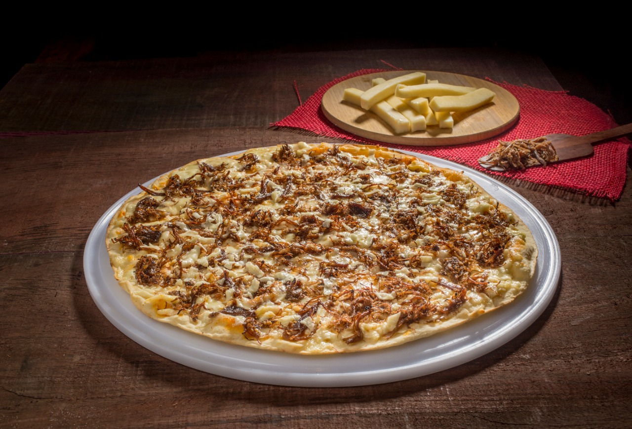 molho de tomate, mussarela, calabresa, bacon, tomate e cebola